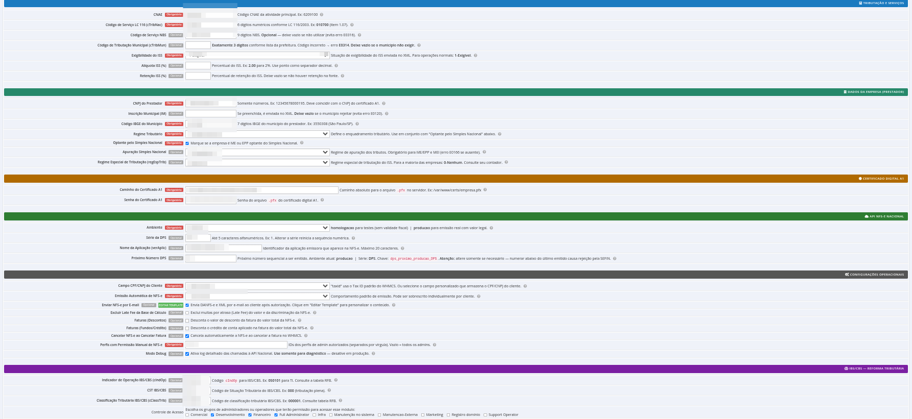 Acesse Admin → Addons → NFS-e Nacional → Configurar e preencha os campos organizados pelas seções abaixo.