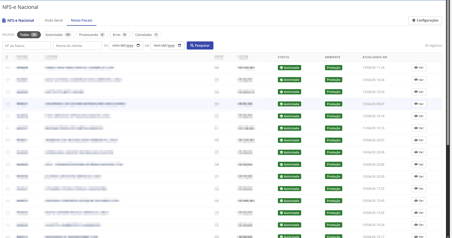 - Crie ou selecione uma fatura de teste e clique em Emitir NFS-e — o status deve retornar