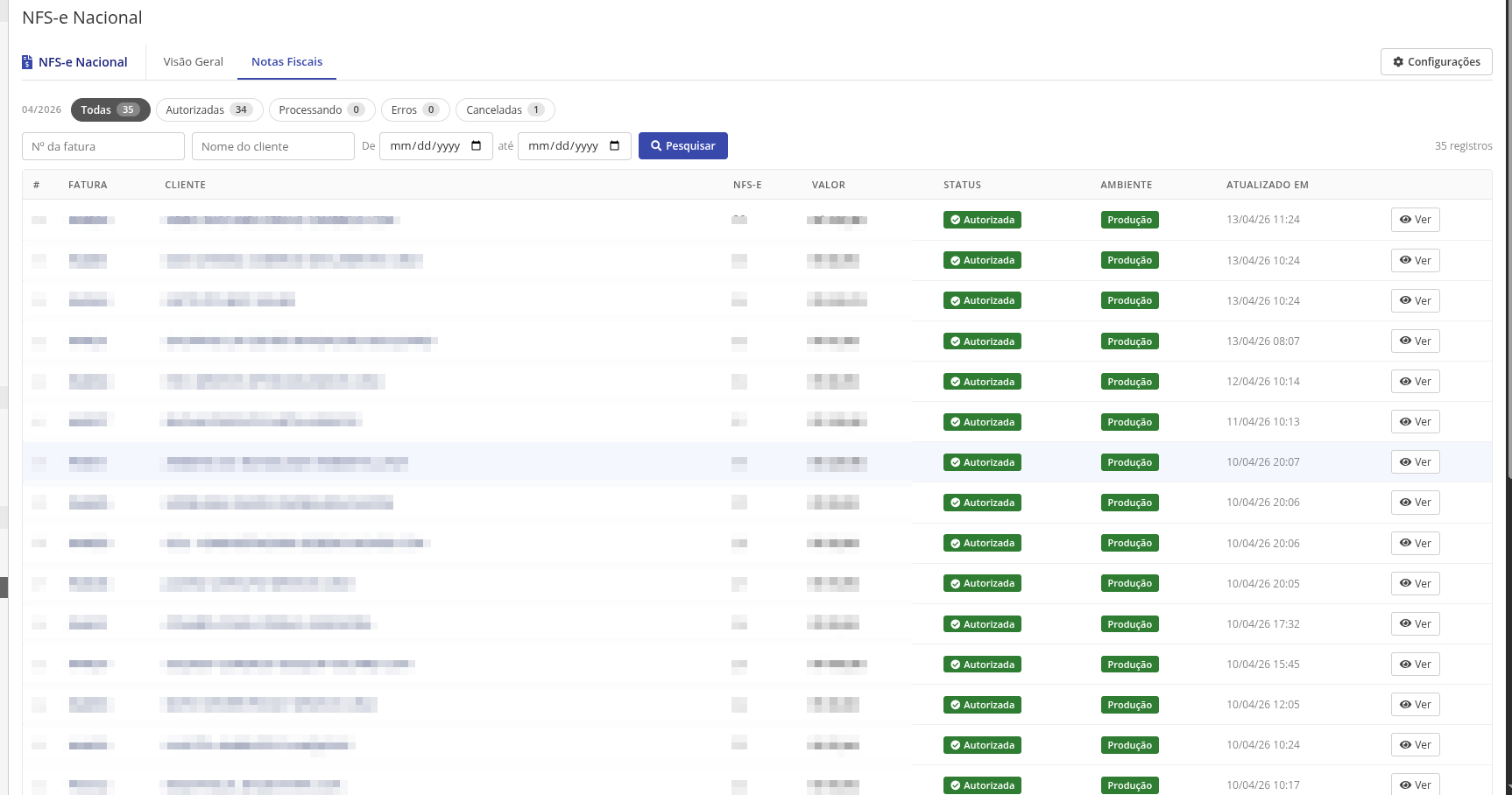 - O painel NFS-e aparece também na tela de edição de cada fatura com botões de ação contextuais.