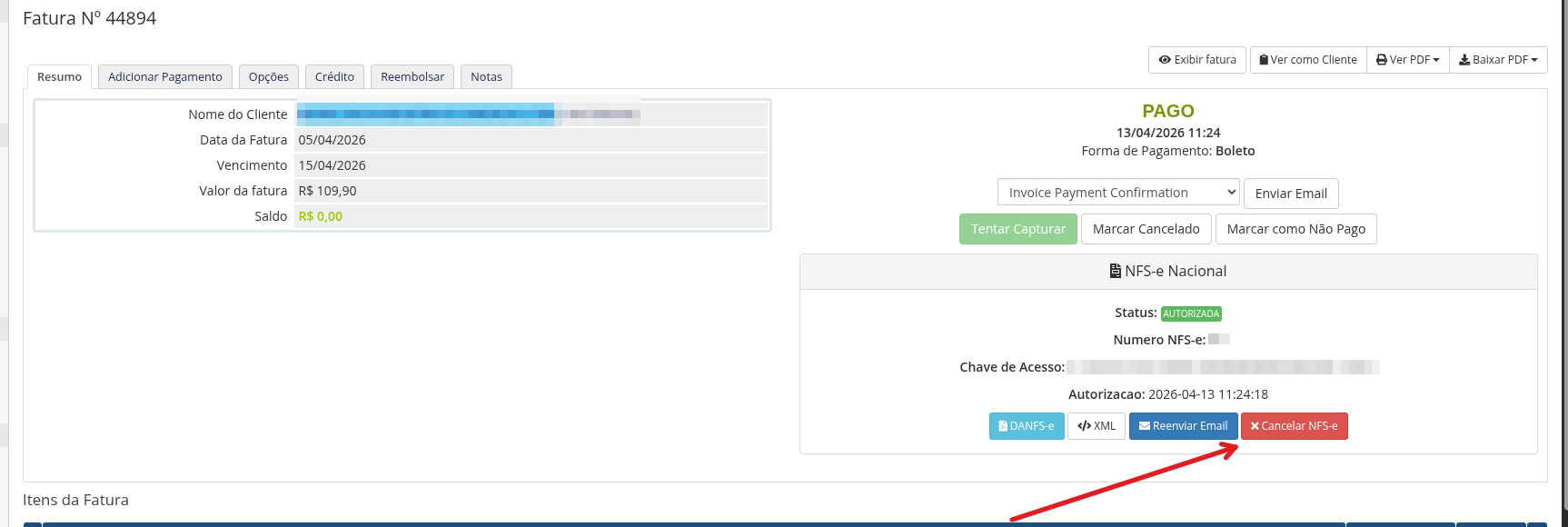 - Aplica-se a: emissão, consulta, cancelamento e reenvio de NFS-e Nacional pelo painel admin do WHMCS