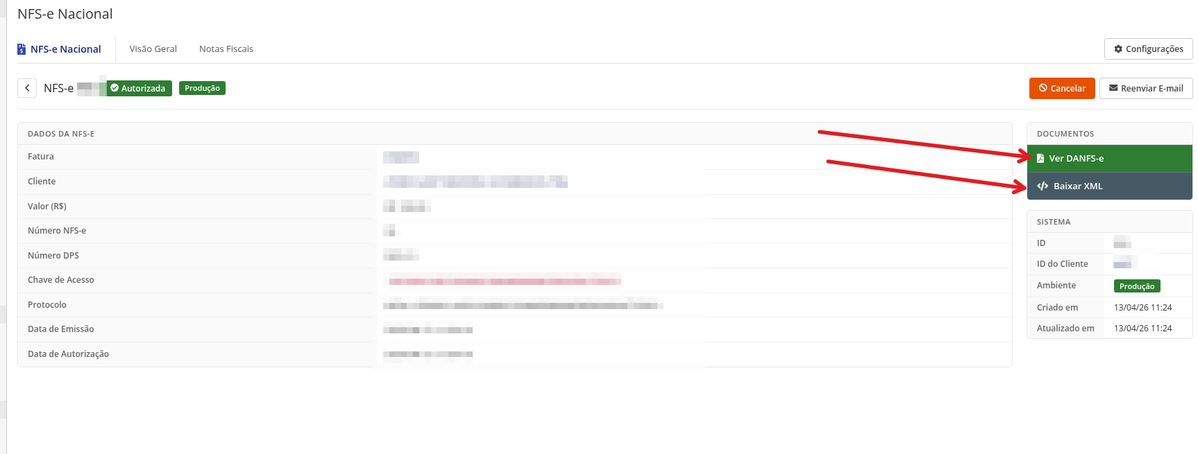 Na página de detalhe ou no painel da fatura, clique em Reenviar E-mail. O e-mail NFS-e Nacional será reenviado ao cliente com os links de DANFS-e e XML.