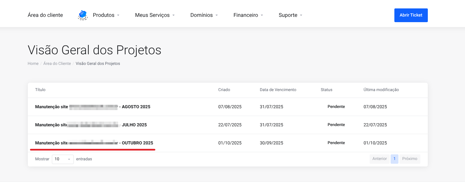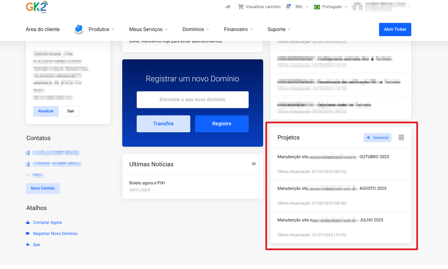 Acesse sua área do cliente e desça até ver um bloco com o título "Projetos" e clique no botão azul "Gerenciar".