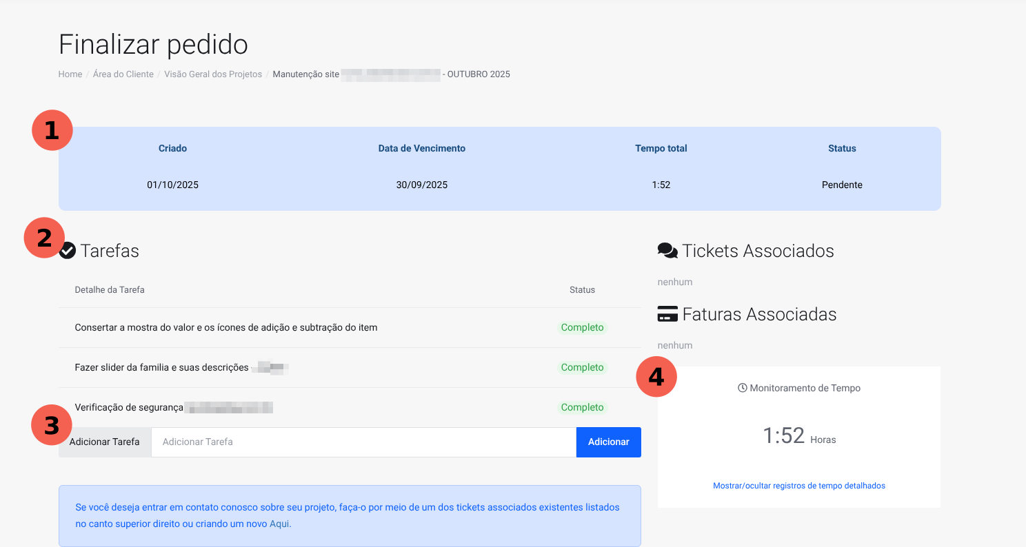 Com o serviço ativo, é necessário que o cliente possa validar e adicionar mais tarefas na Manutenção WordPress e acompanhar as horas de uso de serviço.